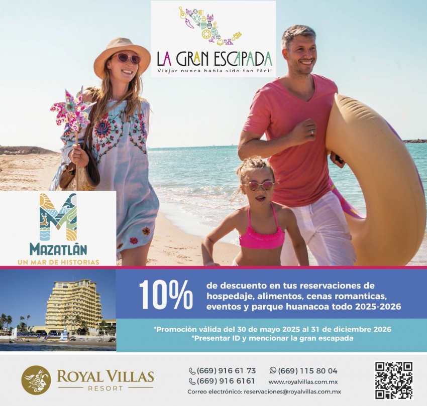 Royal Villas Resort, ubicado en la mejor playa de Mazatlán, en plena Zona Dorada, a muy corta distancia de los principales bares, restaurantes y tiendas. Diseñado especialmente para parejas y familias de buen gusto.